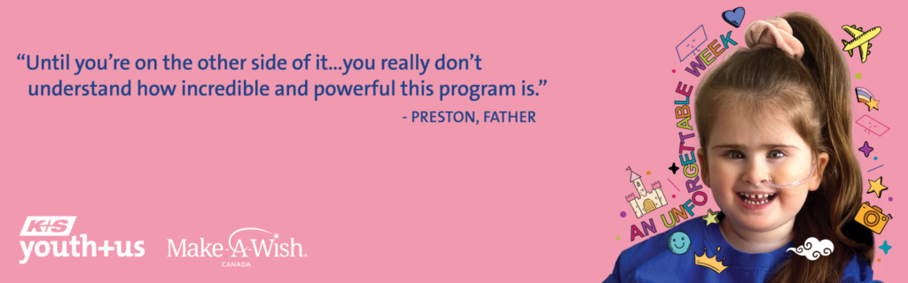 The family arrived back in Saskatchewan to be closer to friends and family for support. Soon, they were regularly travelling between their new home in Moose Jaw and the children’s hospitals in Edmonton and Saskatoon. After about a year, one of their doctors asked if they’d ever considered applying to Make-A-Wish Canada – a Youth+Us partner – for their daughter. “We hadn’t,” Preston says. “We knew about it, but you never really think it applies to you.”